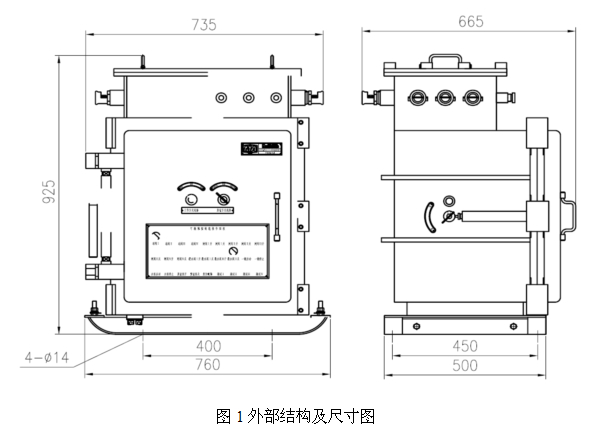 產(chǎn)品結(jié)構(gòu)及外形尺寸控制箱由本安電源、PLC、網(wǎng)絡(luò)設(shè)備、繼電器、接觸器、外殼等組成,其外部結(jié)構(gòu)如圖1所示。